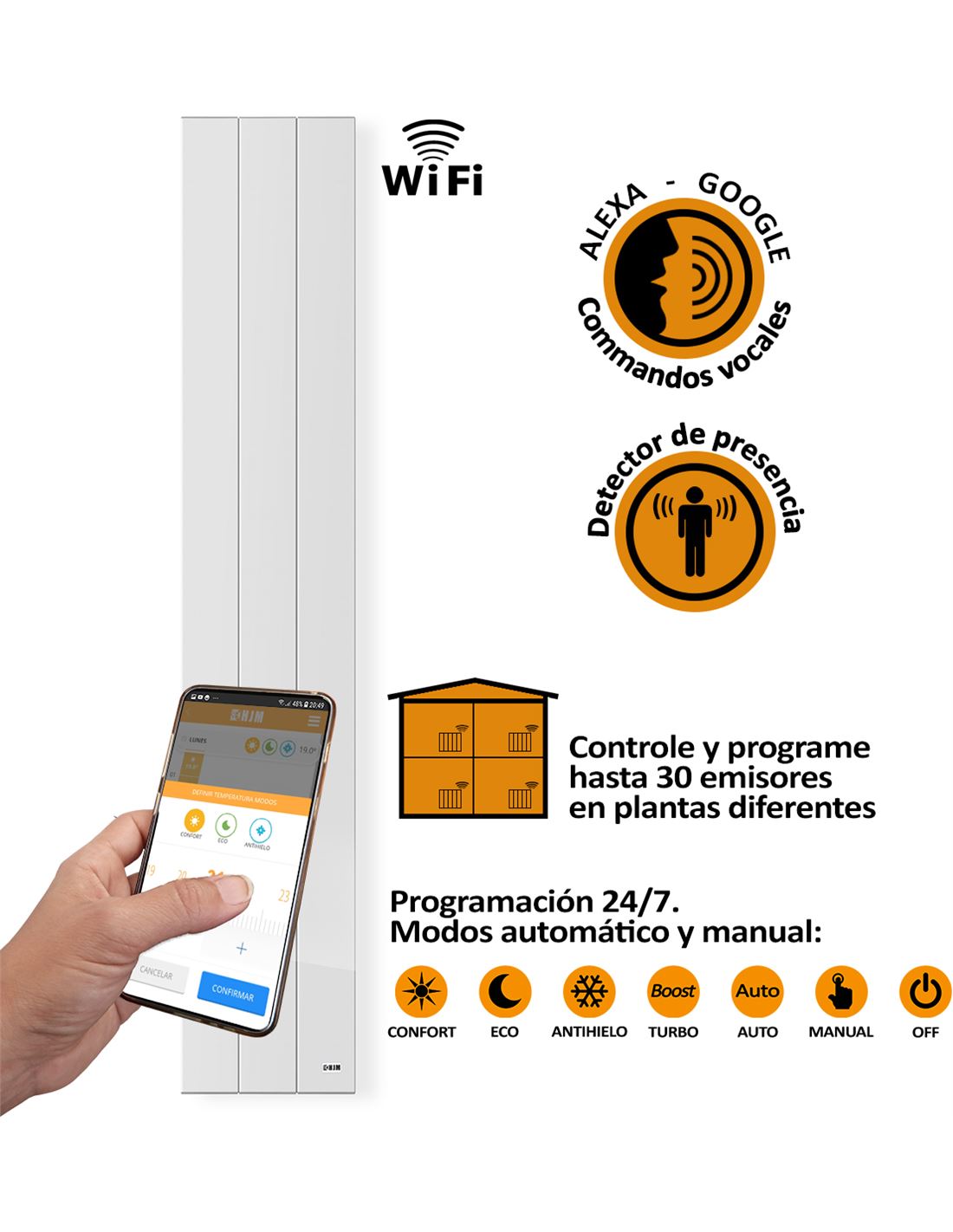 El modelo IXORA, con tecnología WiFi DIRECT, no necesita Smartbox. Solo tienes que descargar nuestra app gratuita HJM, conectar los emisores al router, y gestionar la calefacción de tu hogar, o de varias viviendas, directamente desde tu smartphone. Disfruta de mayor comodidad encendiendo o apagando tus emisores, ajustando la temperatura, monitorizando la temperatura ambiente y programando diferentes modos de funcionamiento desde cualquier estancia, ¡también con tu voz! en tiempo real y con un solo clic, incluso cuando no estés en casa.