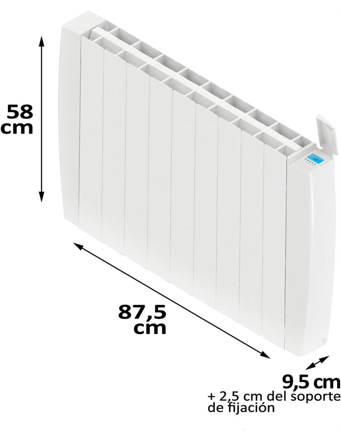 Emisor térmico de bajo consumo con interior cerámico de muy alta inercia térmica y 9 elementos verticales, diseñados para ofrecer un calor homogéneo en toda la superficie. Este sistema garantiza un confort duradero y máxima eficiencia energética, ya que retiene el calor incluso después de apagarse, reduciendo los tiempos de encendido y optimizando el consumo. Con una potencia de 1500W, incluye un termostato programable 24/7 que te ofrece un control total sobre su consumo, adaptándose a tu rutina diaria evitando gastos innecesarios de energía.