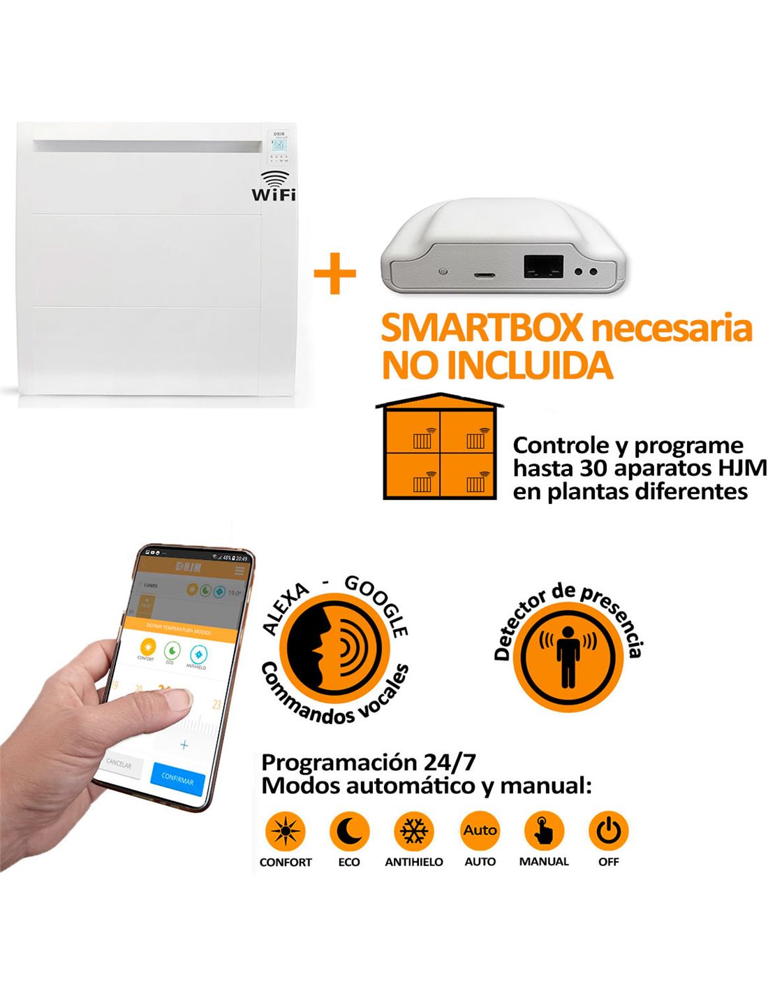 El emisor cerámico de alta inercia térmica IDRA WiFi te ofrece flexibilidad: funciona perfectamente con o sin WiFi (de forma manual). Si decides usar la función WiFi, solo necesitarás adquirir la Smartbox HJM (opcional), descargar nuestra app gratuita HJM, conectar los emisores al router, y gestionar la calefacción de tu hogar, o de varias viviendas, directamente desde tu smartphone. Disfruta de mayor comodidad encendiendo o apagando tus emisores, ajustando la temperatura, monitorizando la temperatura ambiente y programando diferentes modos de funcionamiento desde cualquier estancia, ¡también con tu voz! en tiempo real y con un solo clic, incluso cuando no estés en casa.